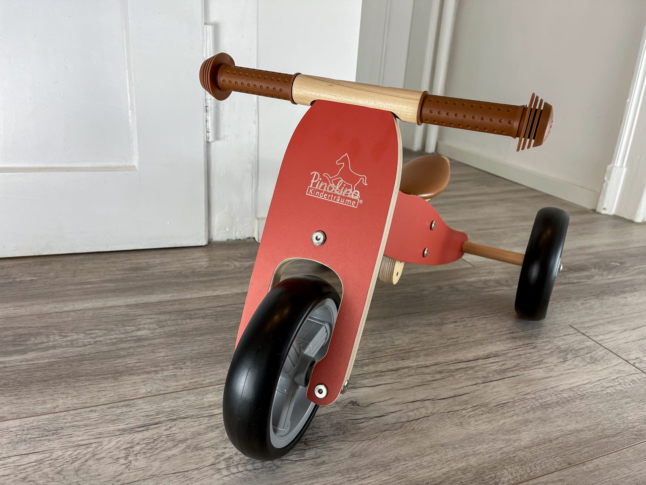 Unser erstes getestetes Laufrad aus Holz ist das No products found.. Es besticht durch mehr als sein Material. Der Rahmen ist um 180 Grad drehbar, was zu einer Änderung der Sitzposition und Fahrdynamik führt. Zudem kann das Pinolino Charlie von einem Dreirad in ein klassisches Laufrad mit zwei Rädern umgebaut werden. Der Sitz lässt sich stufenweise in der Höhe verstellen und bietet damit eine optimale Anpassung an die Größe des Kindes.